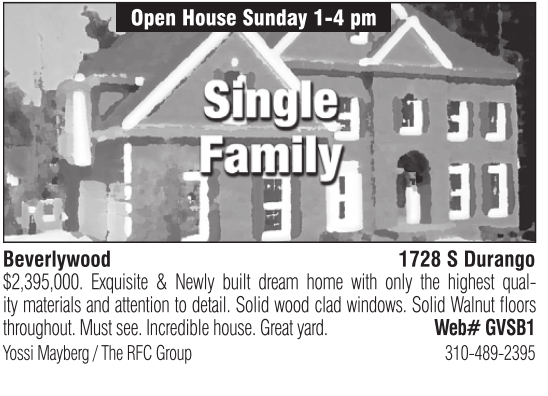 Open House Sunday 1-4 pm Beverlywood 1728 S Durango $2,395,000. Exquisite & Newly built dream home with only the highest quality materials and attention to detail. Solid wood clad windows. Solid Walnut floors throughout. Must see. Incredible house. Great yard. Web# GVSB1 Yossi Mayberg / The RFC Group 310-489-2395