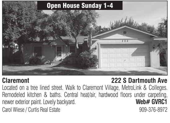 Open House Sunday 1-4 Claremont 222 S Dartmouth Ave Located on a tree lined street. Walk to Claremont Village, MetroLink & Colleges. Remodeled kitchen & baths. Central heat/air, hardwood floors under carpeting, newer exterior paint. Lovely backyard. Web# GVRC1 Carol Wiese / Curtis Real Estate 909-376-8972