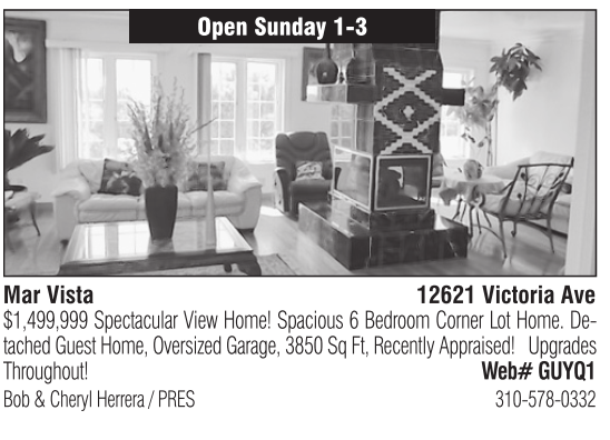 Open Sunday 1-3 Mar Vista 12621 Victoria Ave $1,499,999 Spectacular View Home! Spacious 6 Bedroom Corner Lot Home. Detached Guest Home, Oversized Garage, 3850 Sq Ft, Recently Appraised! Upgrades Throughout! Web# GUYQ1 Bob & Cheryl Herrera / PRES 310-578-0332