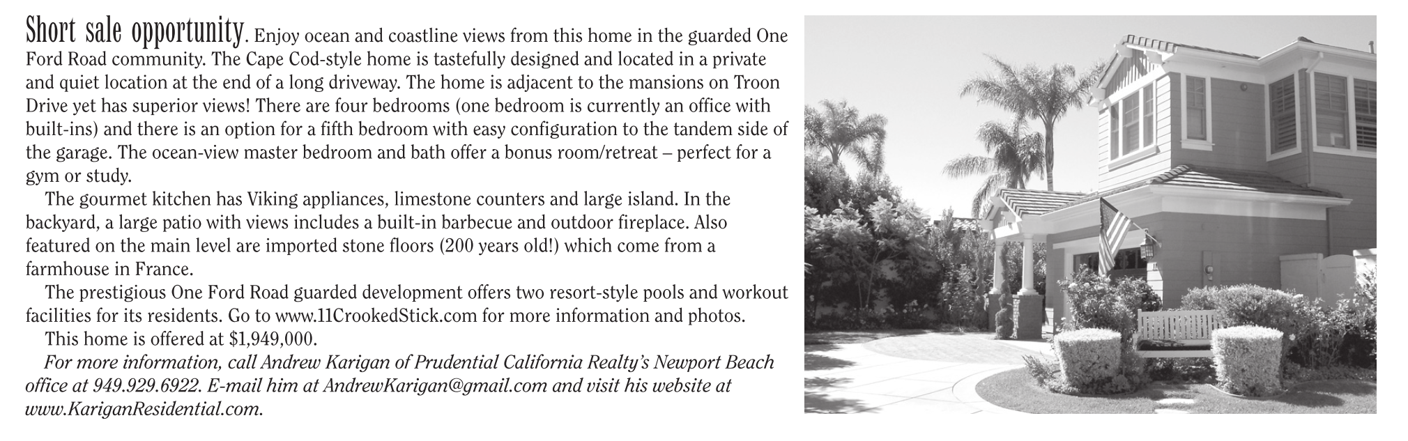 Short sale opportunity. Enjoy ocean and coastline views from this home in the guarded One Ford Road community. The Cape Cod-style home is tastefully designed and located in a private and quiet location at the end of a long driveway. The home is adjacent to the mansions on Troon Drive yet has superior views! There are four bedrooms (one bedroom is currently an office with built-ins) and there is an option for a fifth bedroom with easy configuration to the tandem side of the garage. The ocean-view master bedroom and bath offer a bonus room/retreat – perfect for a gym or study. The gourmet kitchen has Viking appliances, limestone counters and large island. In the backyard, a large patio with views includes a built-in barbecue and outdoor fireplace. Also featured on the main level are imported stone floors (200 years old!) which come from a farmhouse in France. The prestigious One Ford Road guarded development offers two resort-style pools and workout facilities for its residents. Go to www.11CrookedStick.com for more information and photos. This home is offered at $1,949,000. For more information, call Andrew Karigan of Prudential California Realty’s Newport Beach office at 949.929.6922. E-mail him at AndrewKarigan@gmail.com and visit his website at www.KariganResidential.com.