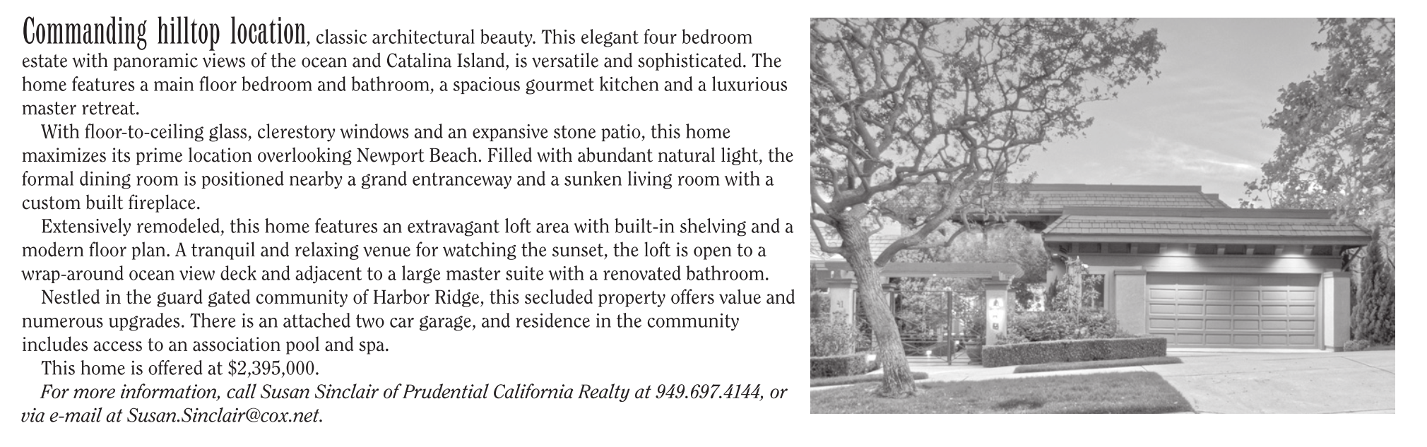 Commanding hilltop location, classic architectural beauty. This elegant four bedroom estate with panoramic views of the ocean and Catalina Island, is versatile and sophisticated. The home features a main floor bedroom and bathroom, a spacious gourmet kitchen and a luxurious master retreat. With floor-to-ceiling glass, clerestory windows and an expansive stone patio, this home maximizes its prime location overlooking Newport Beach. Filled with abundant natural light, the formal dining room is positioned nearby a grand entranceway and a sunken living room with a custom built fireplace. Extensively remodeled, this home features an extravagant loft area with built-in shelving and a modern floor plan. A tranquil and relaxing venue for watching the sunset, the loft is open to a wrap-around ocean view deck and adjacent to a large master suite with a renovated bathroom. Nestled in the guard gated community of Harbor Ridge, this secluded property offers value and numerous upgrades. There is an attached two car garage, and residence in the community includes access to an association pool and spa. This home is offered at $2,395,000. For more information, call Susan Sinclair of Prudential California Realty at 949.697.4144, or via e-mail at Susan.Sinclair@cox.net.