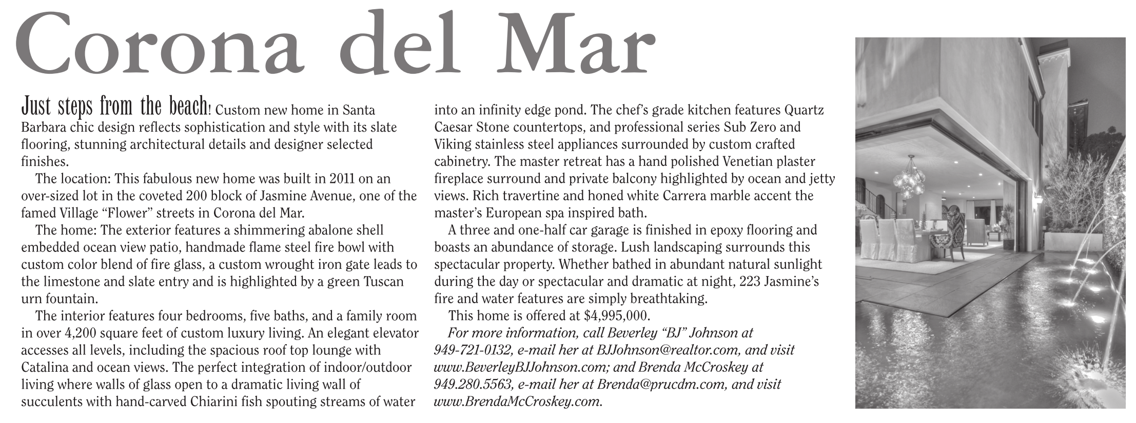 This home is offered at $4,995,000. For more information, call Beverley “BJ” Johnson at 949-721-0132, e-mail her at BJJohnson@realtor.com, and visit www.BeverleyBJJohnson.com; and Brenda McCroskey at 949.280.5563, e-mail her at Brenda@prucdm.com, and visit www.BrendaMcCroskey.com.