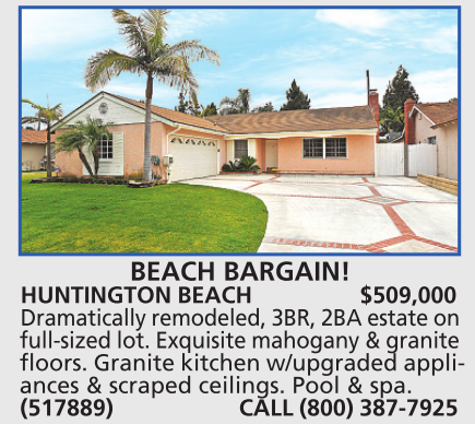 HUNTINGTON BEACH $509,000 Dramatically remodeled, 3BR, 2BA estate on full-sized lot. Exquisite mahogany & granite floors. Granite kitchen w/upgraded appliances & scraped ceilings. Pool & spa.