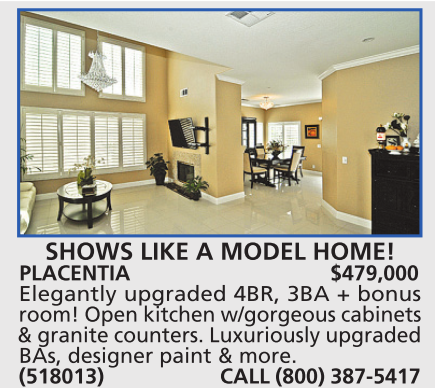 PLACENTIA $479,000 Elegantly upgraded 4BR, 3BA + bonus room! Open kitchen w/gorgeous cabinets & granite counters. Luxuriously upgraded BAs, designer paint & more. (518013) CALL (800) 387-5417