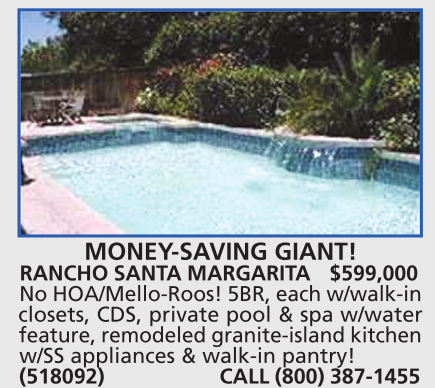 RANCHO SANTA MARGARITA $599,000 No HOA/Mello-Roos! 5BR, each w/walk-in closets, CDS, private pool & spa w/water feature, remodeled granite-island kitchen w/SS appliances & walk-in pantry! (518092) CALL (800) 387-1455