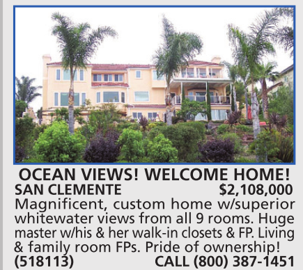 SAN CLEMENTE $2,108,000 Magnificent, custom home w/superior whitewater views from all 9 rooms. Huge master w/his & her walk-in closets & FP. Living & family room FPs. Pride of ownership!