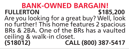 FULLERTON $185,200 Are you looking for a great buy? Well, look no further! This home features 2 spacious BRs & 2BA. One of the BRs has a vaulted ceiling & walk-in closet. (518012) CALL (800) 387-5417