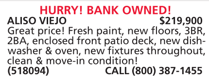ALISO VIEJO $219,900 Great price! Fresh paint, new floors, 3BR, 2BA, enclosed front patio deck, new dishwasher & oven, new fixtures throughout, clean & move-in condition! (518094) CALL (800) 387-1455