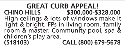 CHINO HILLS $300,000-$328,000 High ceilings & lots of windows make it light & bright. FPs in living room, family room & master. Community pool, spa & children’s play area.