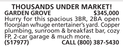 GARDEN GROVE $345,000 Hurry for this spacious 3BR, 2BA open floorplan w/huge entertainer’s yard. Copper plumbing, sunroom & breakfast bar, cozy FP, 2-car garage & much more. (517977) CALL (800) 387-5430