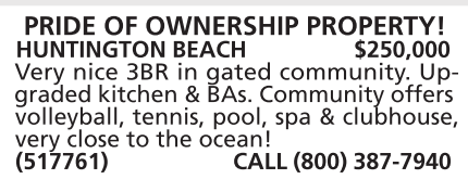 HUNTINGTON BEACH $250,000 Very nice 3BR in gated community. Upgraded kitchen & BAs. Community offers volleyball, tennis, pool, spa & clubhouse, very close to the ocean! (517761) CALL (800) 387-7940