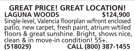 GREAT PRICE! GREAT LOCATION! LAGUNA WOODS $124,900 Single-level, Valencia floorplan w/front enclosed patio, new carpet, fresh paint, atrium w/tiled floors & great sunshine. Bright, shows nice, clean & in move-in condition! 55+. (518029) CALL (800) 387-1455