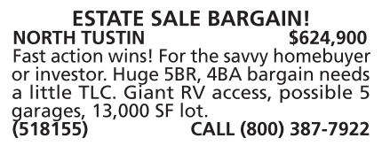 NORTH TUSTIN $624,900 Fast action wins! For the savvy homebuyer or investor. Huge 5BR, 4BA bargain needs a little TLC. Giant RV access, possible 5 garages, 13,000 SF lot. (518155) CALL (800) 387-7922