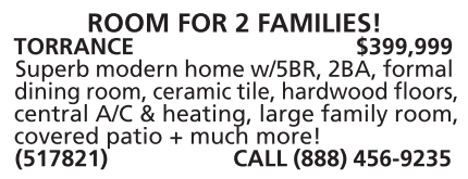 TORRANCE $399,999 Superb modern home w/5BR, 2BA, formal dining room, ceramic tile, hardwood floors, central A/C & heating, large family room, covered patio + much more! (517821) CALL (888) 456-9235