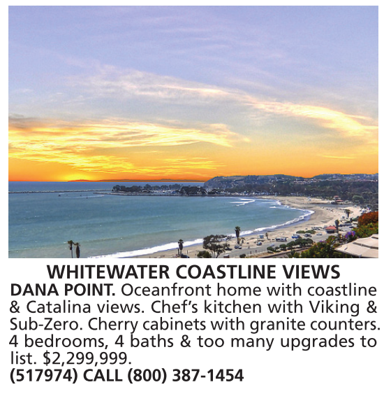 WHITEWATER COASTLINE VIEWS DANA POINT. Oceanfront home with coastline & Catalina views. Chef’s kitchen with Viking & Sub-Zero. Cherry cabinets with granite counters.