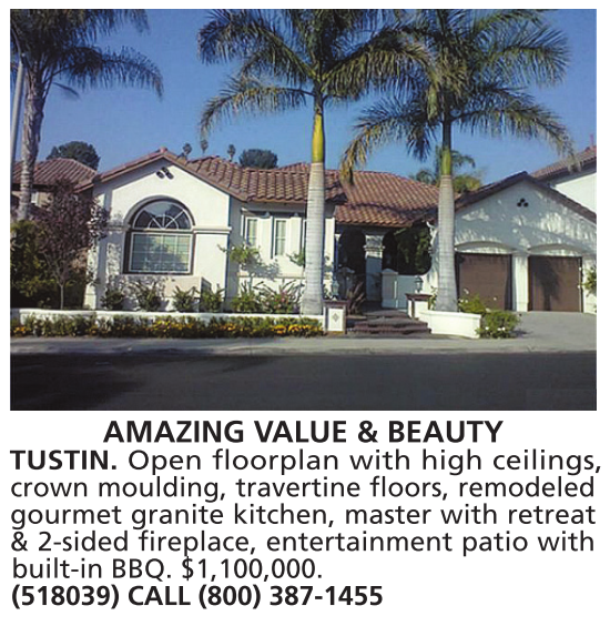 AMAZING VALUE & BEAUTY TUSTIN. Open floorplan with high ceilings, crown moulding, travertine floors, remodeled gourmet granite kitchen, master with retreat & 2-sided fireplace, entertainment patio with built-in BBQ. $1,100,000. (518039) CALL (800) 387-1455