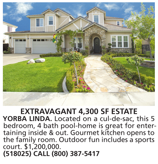 EXTRAVAGANT 4,300 SF ESTATE YORBA LINDA. Located on a cul-de-sac, this 5 bedroom, 4 bath pool-home is great for entertaining inside & out. Gourmet kitchen opens to the family room. Outdoor fun includes a sports court. $1,200,000. (518025) CALL (800) 387-5417