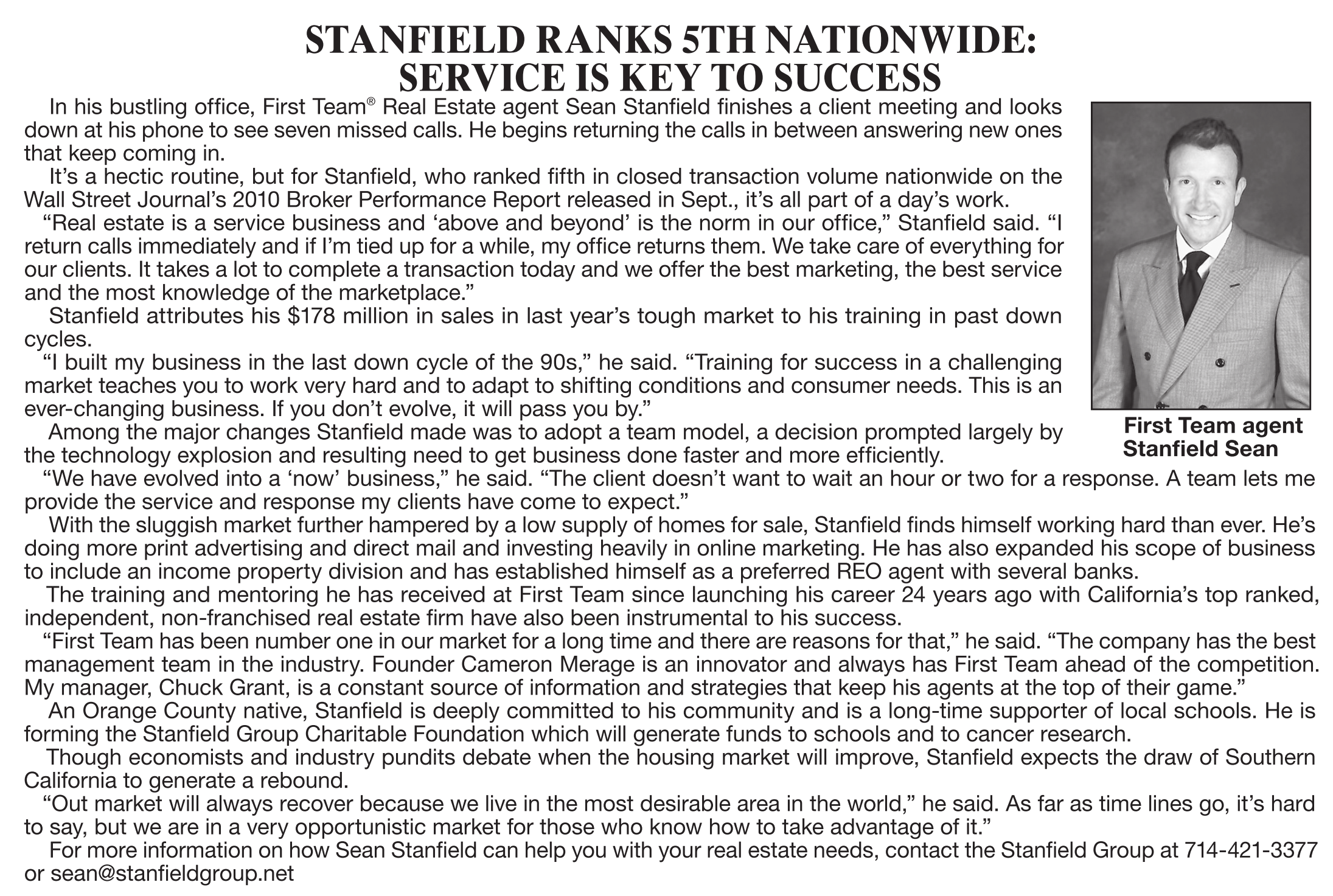 It’s a hectic routine, but for Stanfield, who ranked fifth in closed transaction volume nationwide on the Wall Street Journal’s 2010 Broker Performance Report released in Sept., it’s all part of a day’s work.