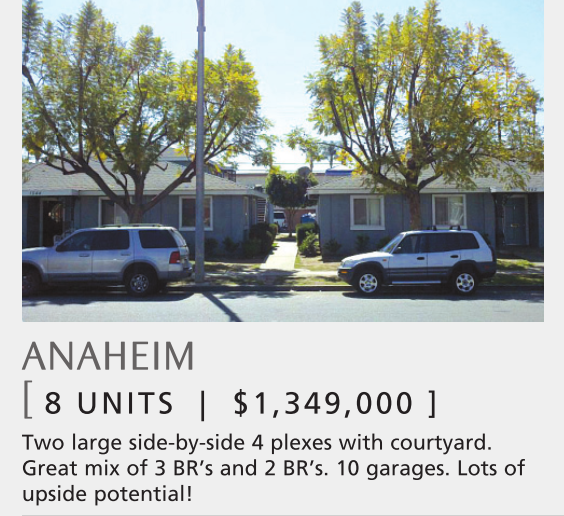 Two large side-by-side 4 plexes with courtyard. Great mix of 3 BR’s and 2 BR’s. 10 garages. Lots of upside potential!