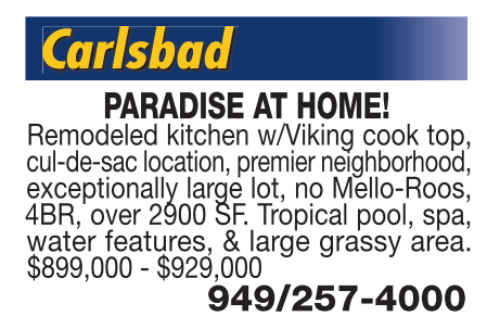 Carlsbad PARADISE AT HOME! Remodeled kitchen w/Viking cook top, cul-de-sac location, premier neighborhood, exceptionally large lot, no Mello-Roos, 4BR, over 2900 SF. Tropical pool, spa, water features, & large grassy area. $899,000 - $929,000 949/257-4000