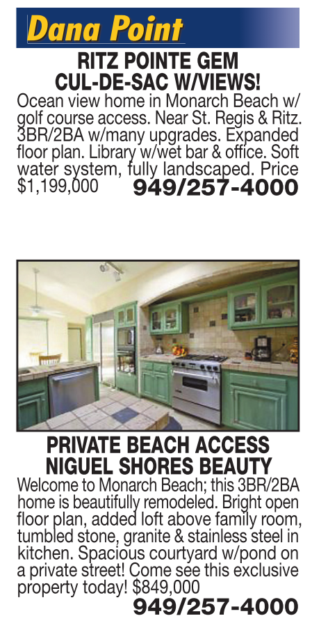 Dana Point RITZ POINTE GEM CUL-DE-SAC W/VIEWS! Ocean view home in Monarch Beach w/ golf course access. Near St. Regis & Ritz. 3BR/2BA w/many upgrades. Expanded floor plan. Library w/wet bar & office. Soft water system, fully landscaped. Price $1,199,000 949/257-4000 PRIVATE BEACH ACCESS NIGUEL SHORES BEAUTY Welcome to Monarch Beach; this 3BR/2BA home is beautifully remodeled. Bright open floor plan, added loft above family room, tumbled stone, granite & stainless steel in kitchen. Spacious courtyard w/pond on a private street! Come see this exclusive property today! $849,000 949/257-4000