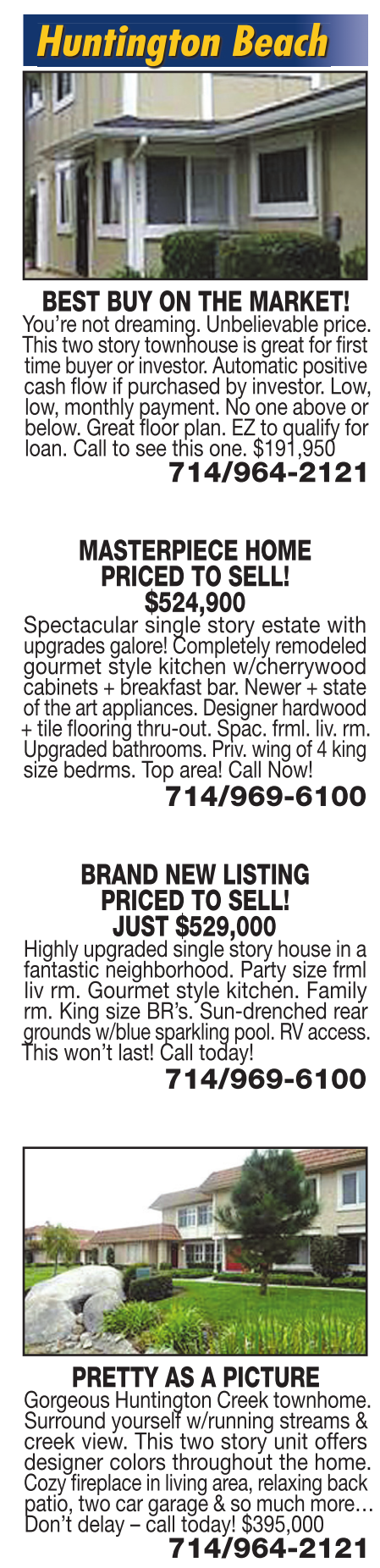 ceiling. Ritz. room, Huntington Beach BEST BUY ON THE MARKET! You’re not dreaming. Unbelievable price. This two story townhouse is great for first time buyer or investor. Automatic positive cash flow if purchased by investor. Low, low, monthly payment. No one above or below. Great floor plan. EZ to qualify for loan. Call to see this one. $191,950 714/964-2121 MASTERPIECE HOME PRICED TO SELL! $524,900 Spectacular single story estate with upgrades galore! Completely remodeled gourmet style kitchen w/cherrywood cabinets + breakfast bar. Newer + state of the art appliances. Designer hardwood + tile flooring thru-out. Spac. frml. liv. rm. Upgraded bathrooms. Priv. wing of 4 king size bedrms. Top area! Call Now! 714/969-6100 BRAND NEW LISTING PRICED TO SELL! JUST $529,000 Highly upgraded single story house in a fantastic neighborhood. Party size frml liv rm. Gourmet style kitchen. Family rm. King size BR’s. Sun-drenched rear grounds w/blue sparkling pool. RV access. This won’t last! Call today! 714/969-6100 PRETTY AS A PICTURE Gorgeous Huntington Creek townhome. Surround yourself w/running streams & creek view. This two story unit offers designer colors throughout the home. Cozy fireplace in living area, relaxing back patio, two car garage & so much more… Don’t delay – call today! $395,000 714/964-2121