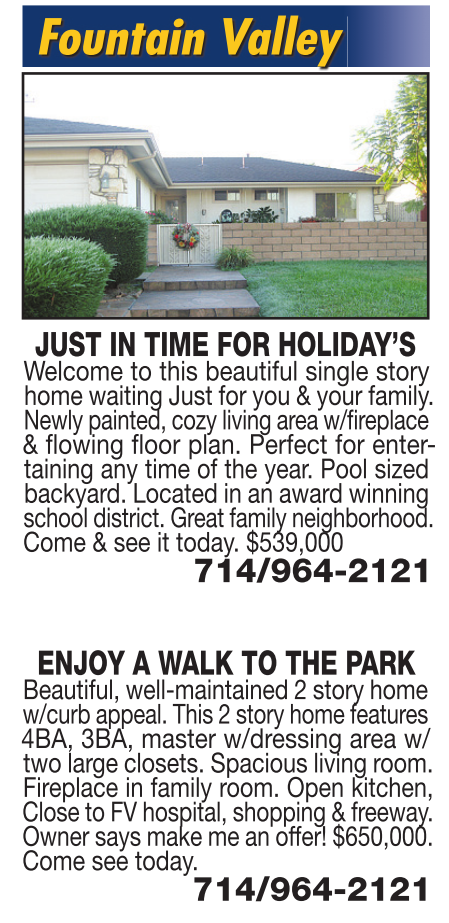 JUST IN TIME FOR HOLIDAY’S Welcome to this beautiful single story home waiting Just for you & your family. Newly painted, cozy living area w/fireplace & flowing floor plan. Perfect for entertaining any time of the year. Pool sized backyard. Located in an award winning school district. Great family neighborhood. Come & see it today. $539,000 714/964-2121