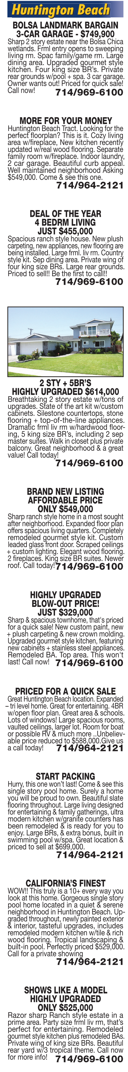 BOLSA LANDMARK BARGAIN 3-CAR GARAGE - $749,900 Sharp 2 story estate near the Bolsa Chica wetlands. Frml entry opens to sweeping living rm. Spac family/game rm. Large dining area. Upgraded gourmet style kitchen. Four king size BR’s. Private rear grounds w/pool + spa. 3 car garage. Owner wants out! Priced for quick sale!