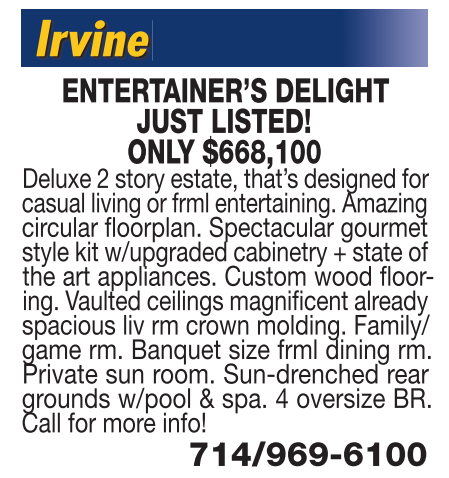 more… Irvine ENTERTAINER’S DELIGHT JUST LISTED! ONLY $668,100 Deluxe 2 story estate, that’s designed for casual living or frml entertaining. Amazing circular floorplan. Spectacular gourmet style kit w/upgraded cabinetry + state of the art appliances. Custom wood flooring. Vaulted ceilings magnificent already spacious liv rm crown molding. Family/ game rm. Banquet size frml dining rm. Private sun room. Sun-drenched rear grounds w/pool & spa. 4 oversize BR. Call for more info! 714/969-6100 See also