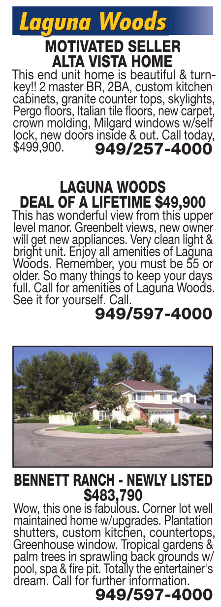 Laguna Woods MOTIVATED SELLER ALTA VISTA HOME This end unit home is beautiful & turnkey!! 2 master BR, 2BA, custom kitchen cabinets, granite counter tops, skylights, Pergo floors, Italian tile floors, new carpet, crown molding, Milgard windows w/self lock, new doors inside & out. Call today, $499,900. 949/257-4000 LAGUNA WOODS DEAL OF A LIFETIME $49,900 This has wonderful view from this upper level manor. Greenbelt views, new owner will get new appliances. Very clean light & bright unit. Enjoy all amenities of Laguna Woods. Remember, you must be 55 or older. So many things to keep your days full. Call for amenities of Laguna Woods. See it for yourself. Call. 949/597-4000 BENNETT RANCH - NEWLY LISTED $483,790 Wow, this one is fabulous. Corner lot well maintained home w/upgrades. Plantation shutters, custom kitchen, countertops, Greenhouse window. Tropical gardens & palm trees in sprawling back grounds w/ pool, spa & fire pit. Totally the entertainer's dream. Call for further information. 949/597-4000