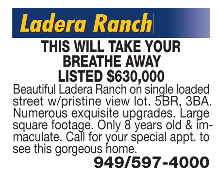 Ladera Ranch THIS WILL TAKE YOUR BREATHE AWAY LISTED $630,000 Beautiful Ladera Ranch on single loaded street w/pristine view lot. 5BR, 3BA. Numerous exquisite upgrades. Large square footage. Only 8 years old & immaculate. Call for your special appt. to see this gorgeous home. 949/597-4000