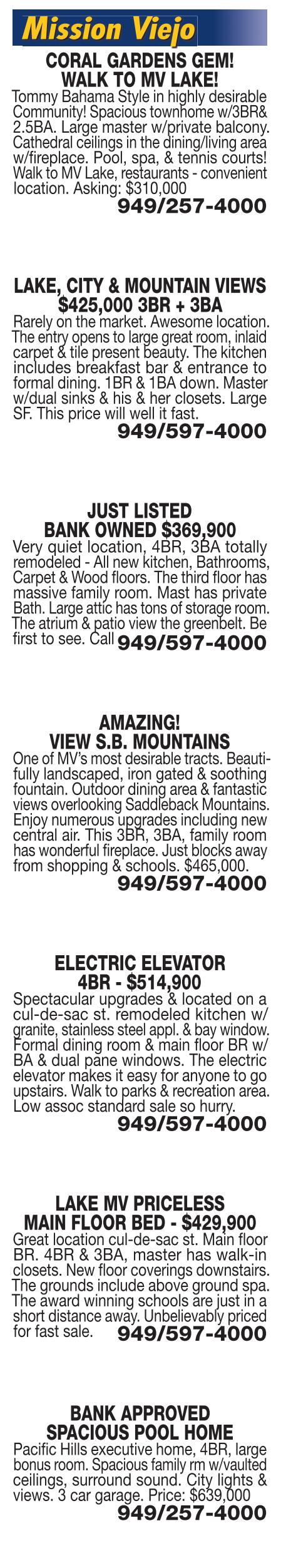 LAKE MV PRICELESS MAIN FLOOR BED - $429,900 Great location cul-de-sac st. Main floor BR. 4BR & 3BA, master has walk-in closets. New floor coverings downstairs. The grounds include above ground spa. The award winning schools are just in a short distance away. Unbelievably priced for fast sale. 949/597-4000