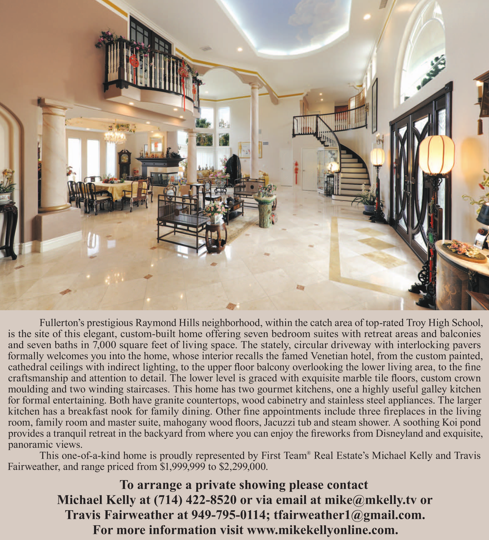 Fullerton’s prestigious Raymond Hills neighborhood, within the catch area of top-rated Troy High School, is the site of this elegant, custom-built home offering seven bedroom suites with retreat areas and balconies and seven baths in 7,000 square feet of living space. The stately, circular driveway with interlocking pavers formally welcomes you into the home, whose interior recalls the famed Venetian hotel, from the custom painted, cathedral ceilings with indirect lighting, to the upper floor balcony overlooking the lower living area, to the fine craftsmanship and attention to detail. The lower level is graced with exquisite marble tile floors, custom crown moulding and two winding staircases. This home has two gourmet kitchens, one a highly useful galley kitchen for formal entertaining. Both have granite countertops, wood cabinetry and stainless steel appliances. The larger kitchen has a breakfast nook for family dining. Other fine appointments include three fireplaces in the living room, family room and master suite, mahogany wood floors, Jacuzzi tub and steam shower. A soothing Koi pond provides a tranquil retreat in the backyard from where you can enjoy the fireworks from Disneyland and exquisite, panoramic views.