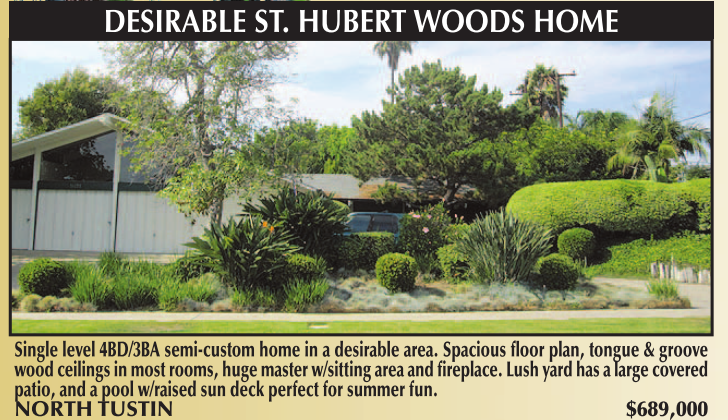 DESIRABLE ST. HUBERT WOODS HOME Single level 4BD/3BA semi-custom home in a desirable area. Spacious floor plan, tongue & groove wood ceilings in most rooms, huge master w/sitting area and fireplace. Lush yard has a large covered patio, and a pool w/raised sun deck perfect for summer fun. NORTH TUSTIN $689,000