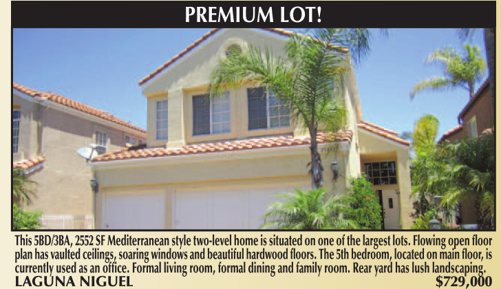 This 5BD/3BA, 2552 SF Mediterranean style two-level home is situated on one of the largest lots. Flowing open floor plan has vaulted ceilings, soaring windows and beautiful hardwood floors. The 5th bedroom, located on main floor, is currently used as an office. Formal living room, formal dining and family room. Rear yard has lush landscaping. LAGUNA NIGUEL $729,000