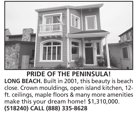 LONG BEACH. Built in 2001, this beauty is beach close. Crown mouldings, open island kitchen, 12- ft. ceilings, maple floors & many more amenities make this your dream home! $1,310,000. (518240) CALL (888) 335-8628