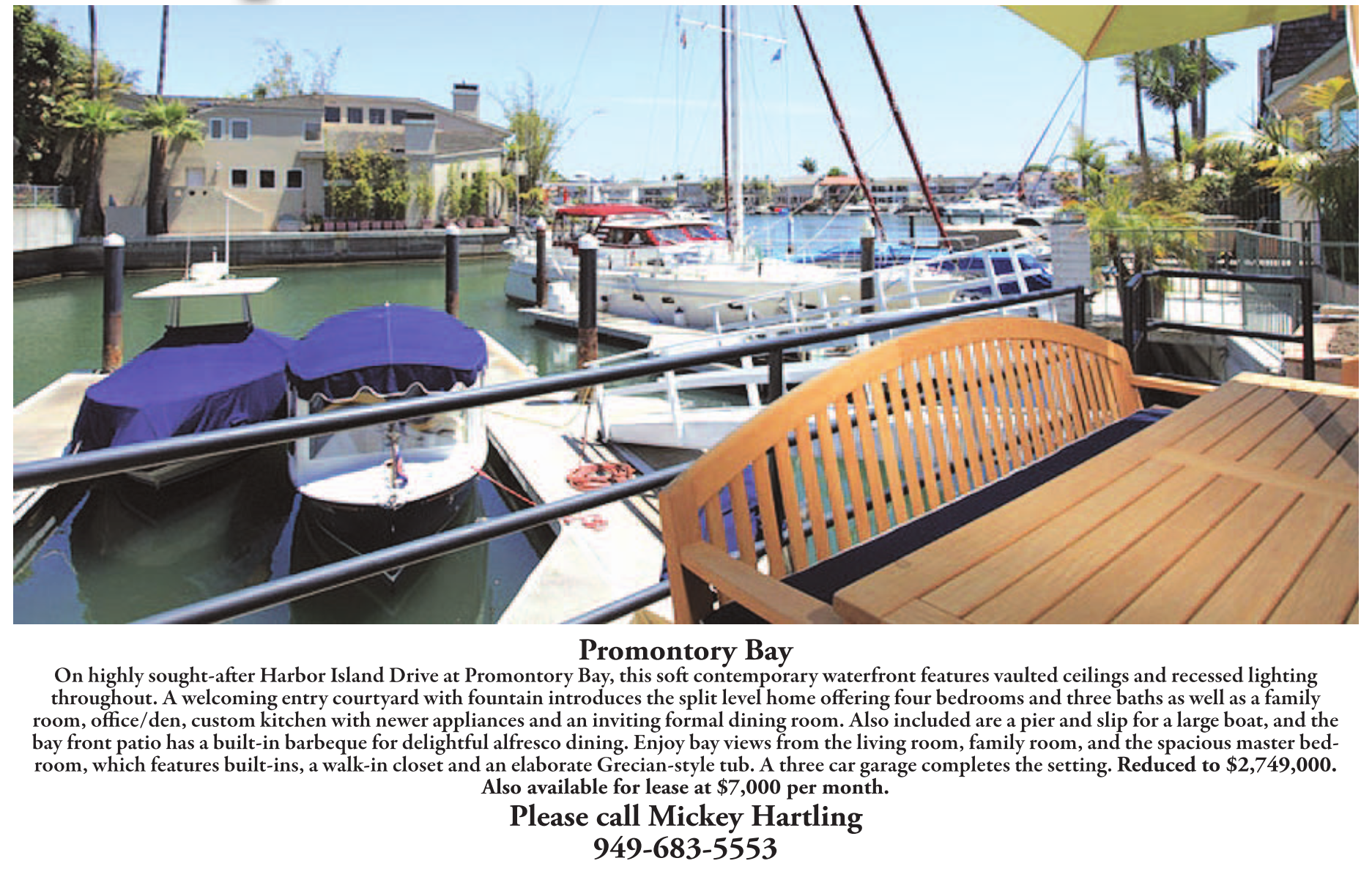 On highly sought-after Harbor Island Drive at Promontory Bay, this soft contemporary waterfront features vaulted ceilings and recessed lighting throughout. A welcoming entry courtyard with fountain introduces the split level home offering four bedrooms and three baths as well as a family room, office/den, custom kitchen with newer appliances and an inviting formal dining room. Also included are a pier and slip for a large boat, and the bay front patio has a built-in barbeque for delightful alfresco dining. Enjoy bay views from the living room, family room, and the spacious master bedroom, which features built-ins, a walk-in closet and an elaborate Grecian-style tub. A three car garage completes the setting. Reduced to $2,749,000.