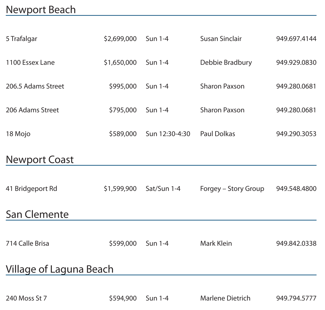 5 Trafalgar $2,699,000 Sun 1-4 Susan Sinclair 949.697.4144
