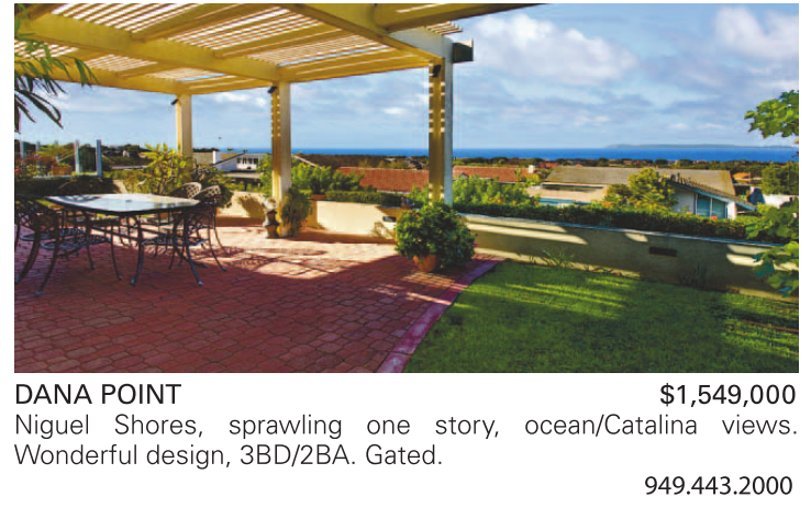 DANA POINT $1,549,000 Niguel Shores, sprawling one story, ocean/Catalina views. Wonderful design, 3BD/2BA. Gated.