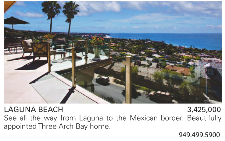 LAGUNA BEACH 3,425,000 See all the way from Laguna to the Mexican border. Beautifully appointed Three Arch Bay home.