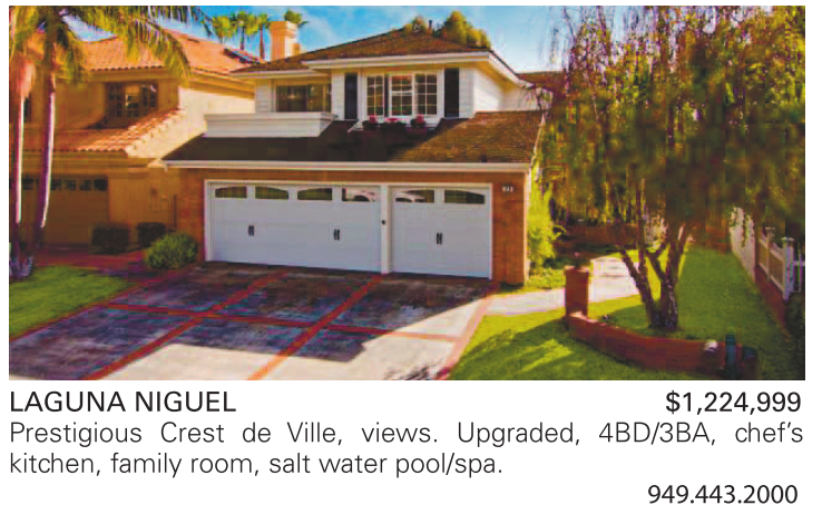 LAGUNA NIGUEL $1,224,999 Prestigious Crest de Ville, views. Upgraded, 4BD/3BA, chef’s kitchen, family room, salt water pool/spa.