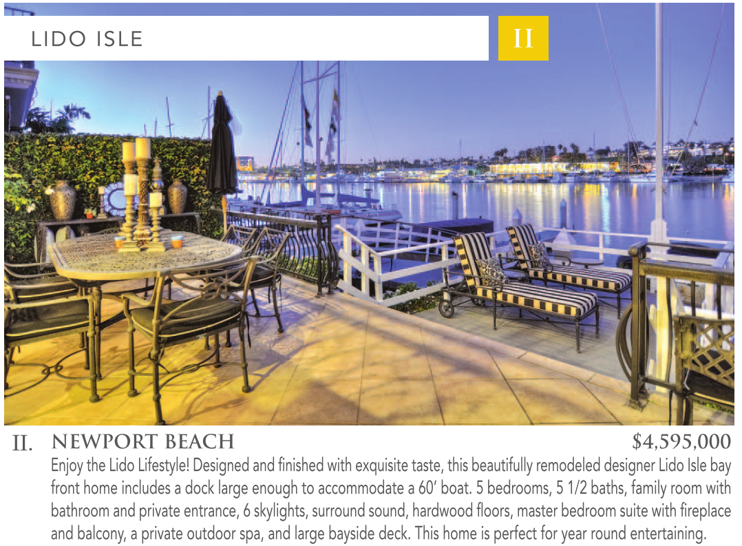 NEWPORT BEACH $4,595,000 Enjoy the Lido Lifestyle! Designed and finished with exquisite taste, this beautifully remodeled designer Lido Isle bay front home includes a dock large enough to accommodate a 60’ boat. 5 bedrooms, 5 1/2 baths, family room with bathroom and private entrance, 6 skylights, surround sound, hardwood floors, master bedroom suite with fireplace and balcony, a private outdoor spa, and large bayside deck. This home is perfect for year round entertaining.