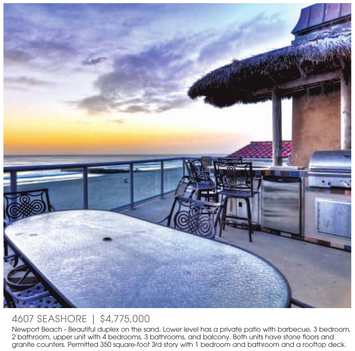 4607 SEASHORE | $4,775,000 Newport Beach - Beautiful duplex on the sand. Lower level has a private patio with barbecue, 3 bedroom, 2 bathroom, upper unit with 4 bedrooms, 3 bathrooms, and balcony. Both units have stone floors and granite counters. Permitted 350 square-foot 3rd story with 1 bedroom and bathroom and a rooftop deck.