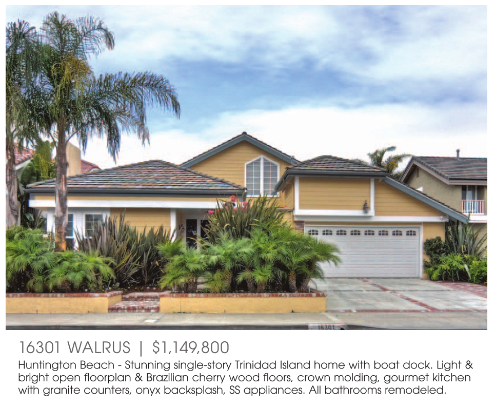 16301 WALRUS | $1,149,800 Huntington Beach - Stunning single-story Trinidad Island home with boat dock. Light & bright open floorplan & Brazilian cherry wood floors, crown molding, gourmet kitchen with granite counters, onyx backsplash, SS appliances. All bathrooms remodeled.