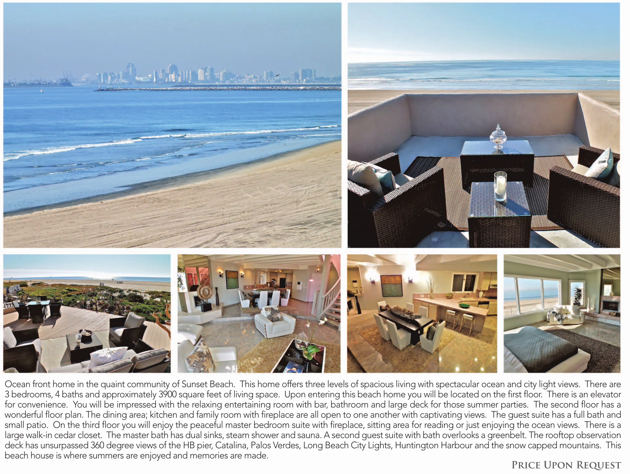 Ocean front home in the quaint community of Sunset Beach. This home offers three levels of spacious living with spectacular ocean and city light views. There are 3 bedrooms, 4 baths and approximately 3900 square feet of living space. Upon entering this beach home you will be located on the first floor. There is an elevator for convenience. You will be impressed with the relaxing entertaining room with bar, bathroom and large deck for those summer parties. The second floor has a wonderful floor plan. The dining area; kitchen and family room with fireplace are all open to one another with captivating views. The guest suite has a full bath and small patio. On the third floor you will enjoy the peaceful master bedroom suite with fireplace, sitting area for reading or just enjoying the ocean views. There is a large walk-in cedar closet. The master bath has dual sinks, steam shower and sauna. A second guest suite with bath overlooks a greenbelt. The rooftop observation deck has unsurpassed 360 degree views of the HB pier, Catalina, Palos Verdes, Long Beach City Lights, Huntington Harbour and the snow capped mountains. This beach house is where summers are enjoyed and memories are made.