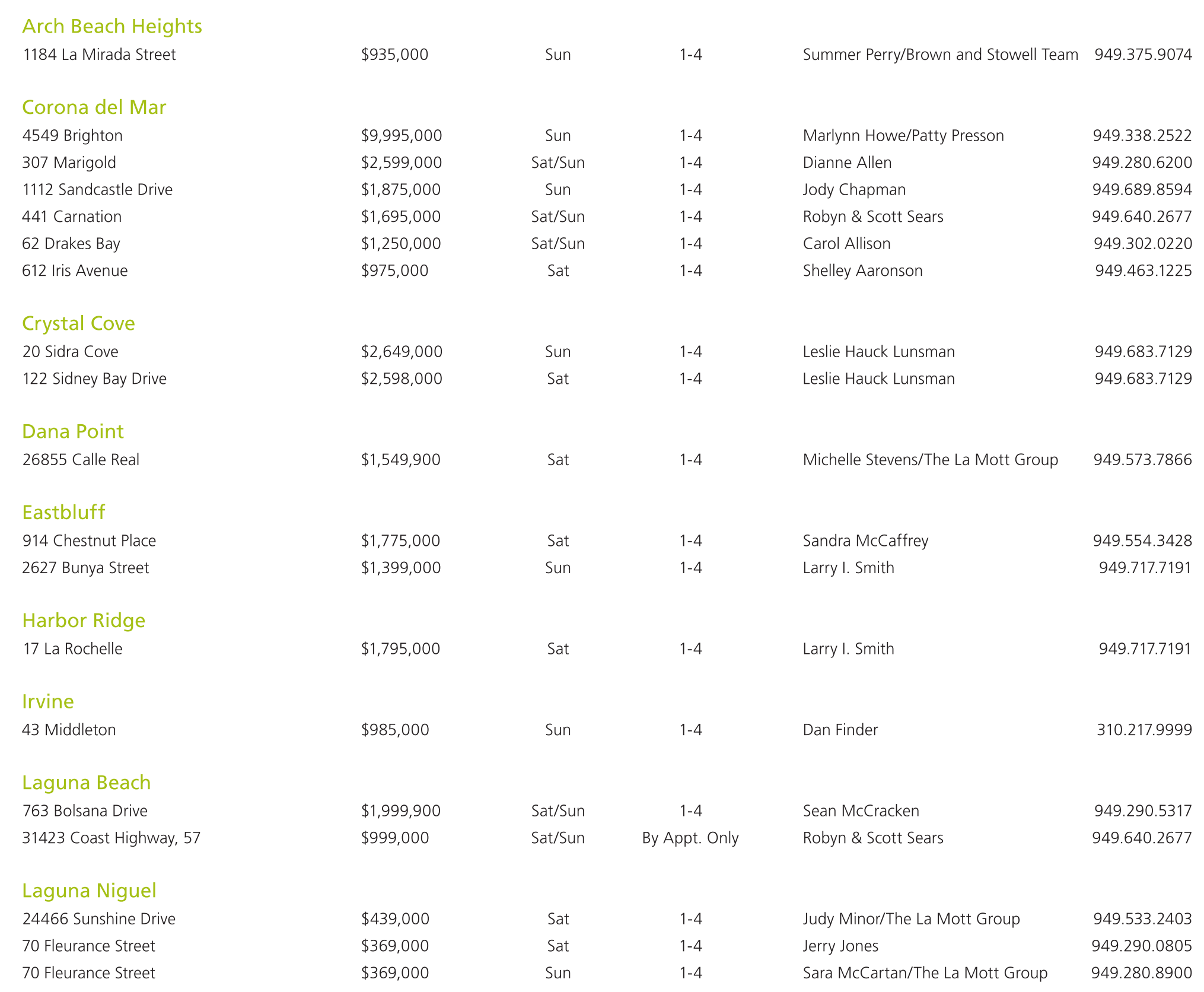 441 Carnation $1,695,000 Sat/Sun 1-4 Robyn & Scott Sears 949.640.2677