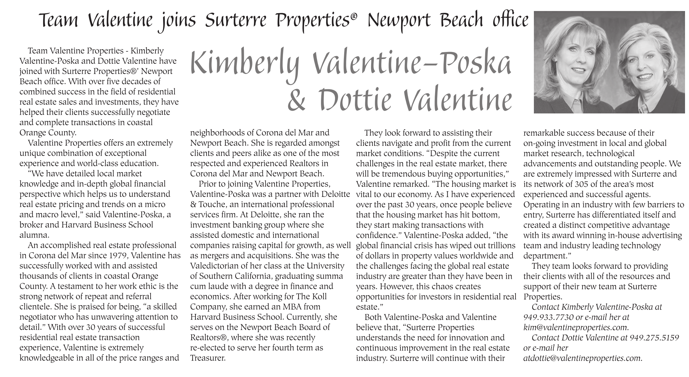 Team Valentine Properties - Kimberly Valentine-Poska and Dottie Valentine have joined with Surterre Properties®’ Newport Beach office. With over five decades of combined success in the field of residential real estate sales and investments, they have helped their clients successfully negotiate and complete transactions in coastal Orange County.