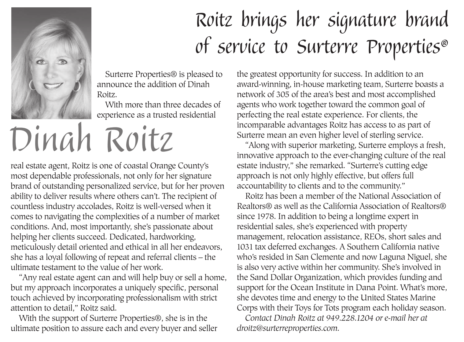Contact Dinah Roitz at 949.228.1204 or e-mail her at droitz@surterreproperties.com.