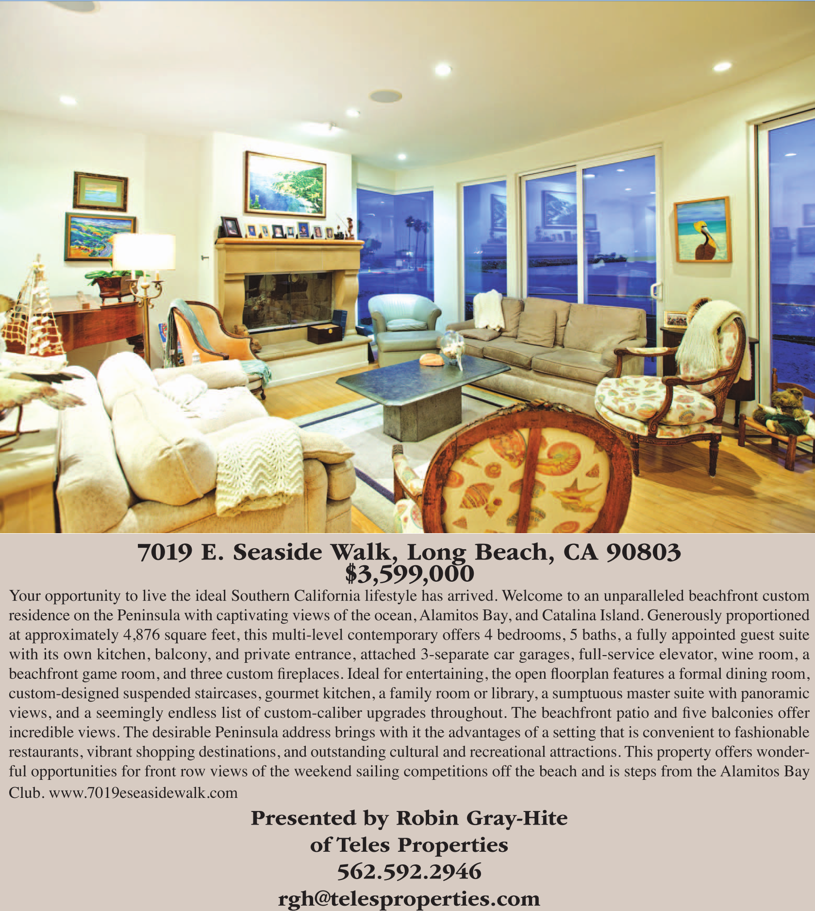 7019 E. Seaside Walk, Long Beach, CA 90803 $3,599,000 Your opportunity to live the ideal Southern California lifestyle has arrived. Welcome to an unparalleled beachfront custom residence on the Peninsula with captivating views of the ocean, Alamitos Bay, and Catalina Island. Generously proportioned at approximately 4,876 square feet, this multi-level contemporary offers 4 bedrooms, 5 baths, a fully appointed guest suite with its own kitchen, balcony, and private entrance, attached 3-separate car garages, full-service elevator, wine room, a beachfront game room, and three custom fireplaces. Ideal for entertaining, the open floorplan features a formal dining room, custom-designed suspended staircases, gourmet kitchen, a family room or library, a sumptuous master suite with panoramic views, and a seemingly endless list of custom-caliber upgrades throughout. The beachfront patio and five balconies offer incredible views. The desirable Peninsula address brings with it the advantages of a setting that is convenient to fashionable restaurants, vibrant shopping destinations, and outstanding cultural and recreational attractions. This property offers wonderful opportunities for front row views of the weekend sailing competitions off the beach and is steps from the Alamitos Bay Club. www.7019eseasidewalk.com Presented by Robin Gray-Hite of Teles Properties 562.592.2946 rgh@telesproperties.com
