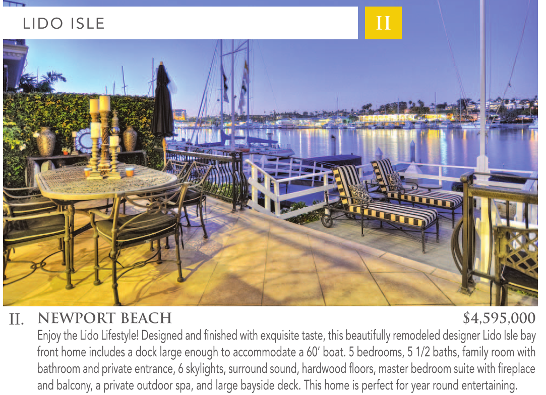 NEWPORT BEACH $4,595,000 Enjoy the Lido Lifestyle! Designed and finished with exquisite taste, this beautifully remodeled designer Lido Isle bay front home includes a dock large enough to accommodate a 60’ boat. 5 bedrooms, 5 1/2 baths, family room with bathroom and private entrance, 6 skylights, surround sound, hardwood floors, master bedroom suite with fireplace and balcony, a private outdoor spa, and large bayside deck. This home is perfect for year round entertaining.